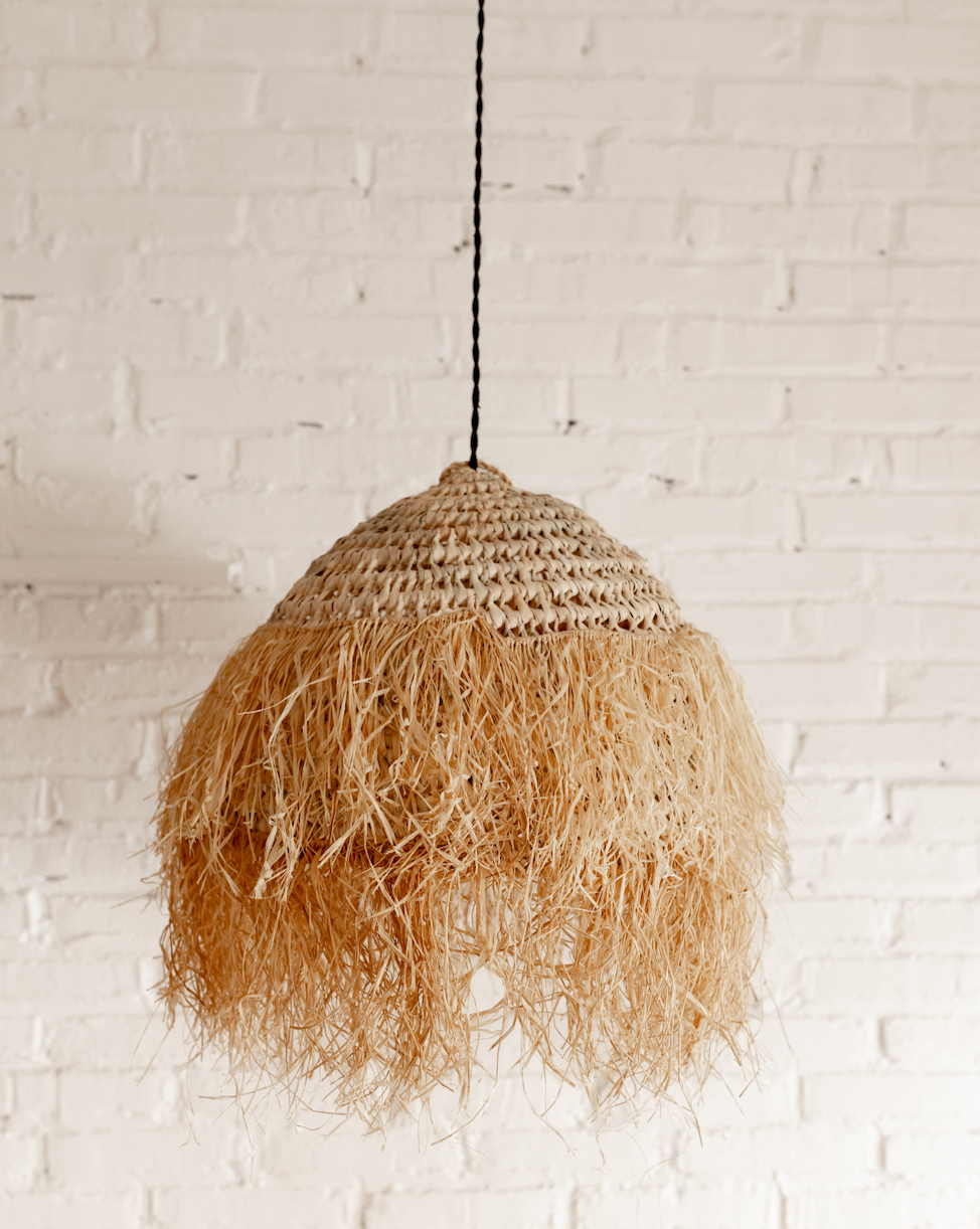Su original y sofisticado diseño, presenta una pantalla en caña trenzada de la que cuelgan unos informales y divertidos flecos de rafia. Le acompaña un cable de cuerda de color negro. No esperes más e ilumina tus estancias de forma diferente con esta preciosa lámpara. Es la opción perfecta para incluir en tu salón, comedor, dormitorio o en la habitación de los niños creando espacios relajados y cálidos.
